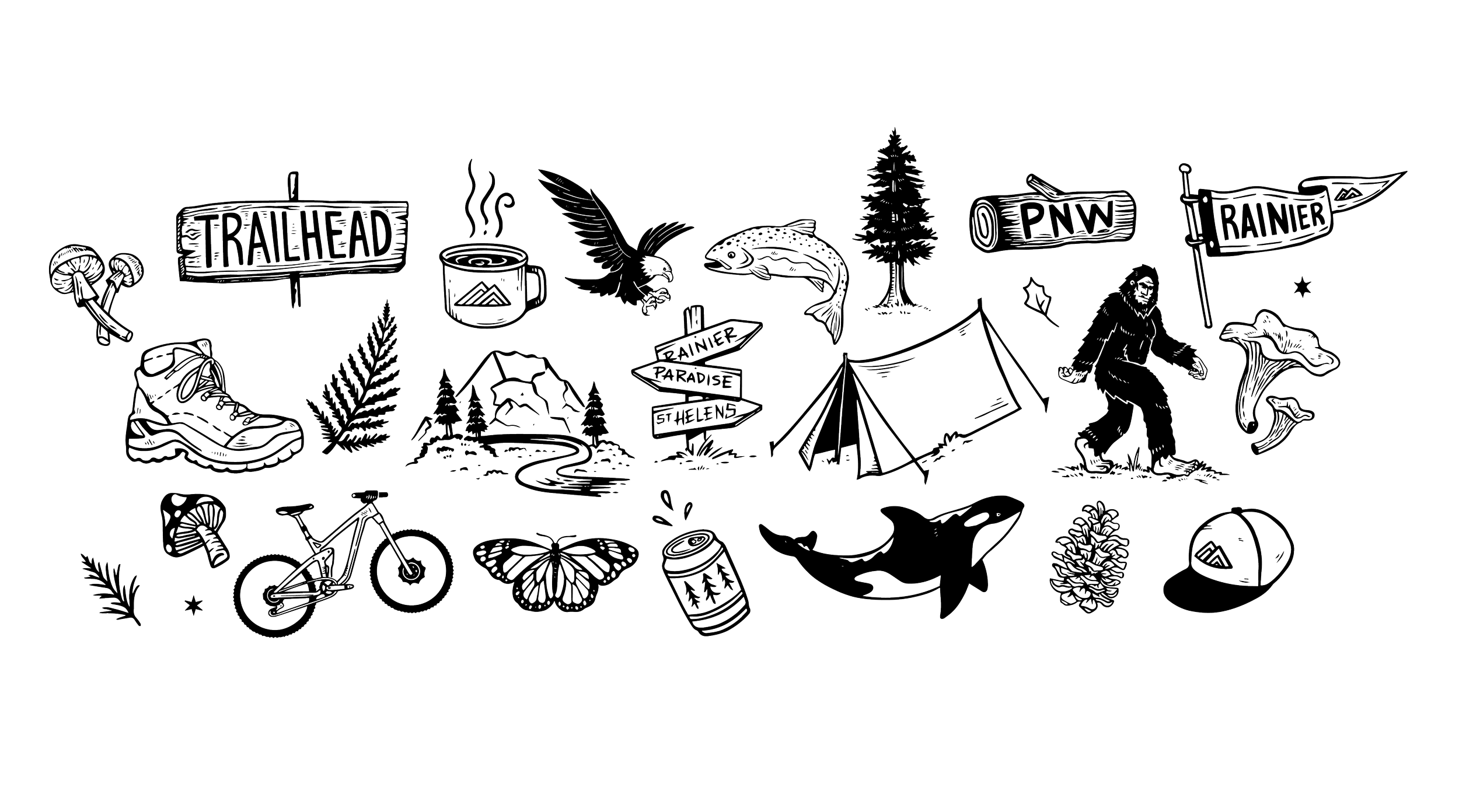 Custom Northwest-inspired illustrations created for a local Washington State outdoors company. This pattern features iconic Northwest imagery, from orcas to Sasquatch, along with scenes from beloved state parks. Every purchase also contributes to protecting our national parks!